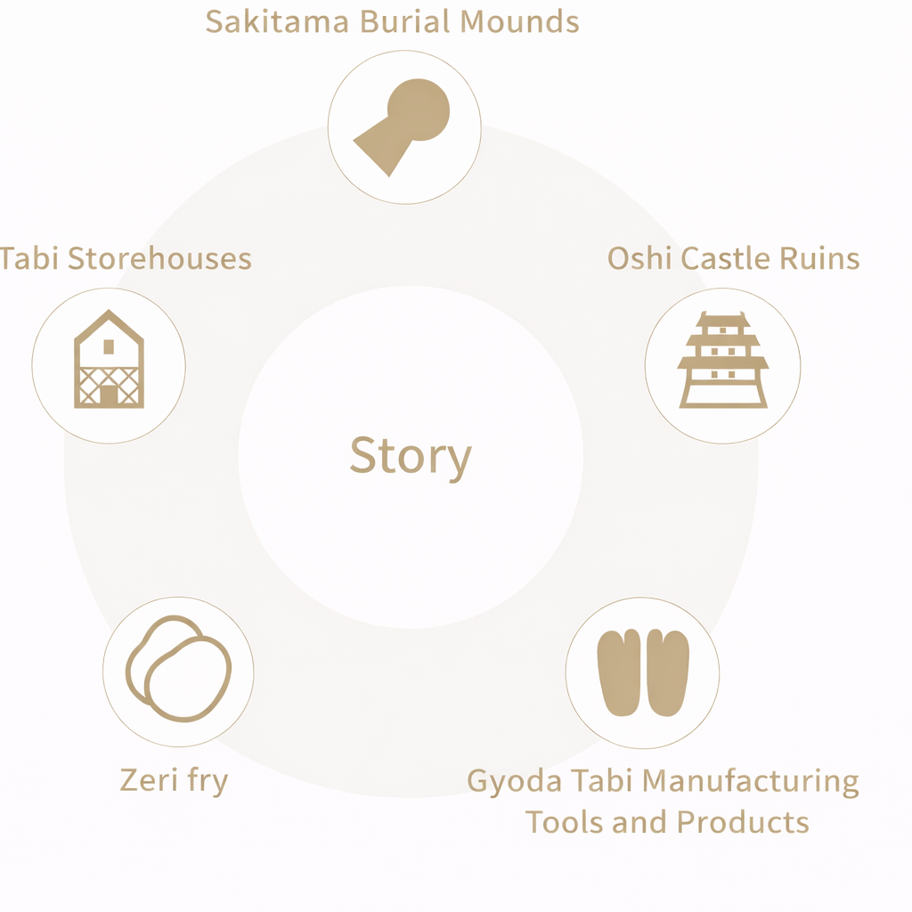 The sound of sewing machines emanates from small factories and workshops, carrying through the backstreets of Gyoda, where craftspeople continue to produce tabi (split-toe socks) as they have for around 300 years. Along these streets stand tabi storehouses built of earth, stone, and mortar, many of which date to the latter half of the Meiji period (1868–1912). The industry began as side work for the wives of samurai and later developed into a major local enterprise. At its peak, Gyoda produced about 80% of the country’s tabi. Although production has since declined, the city remains a leading center of tabi manufacturing, and its many historical buildings, including the storehouses, preserve this history.