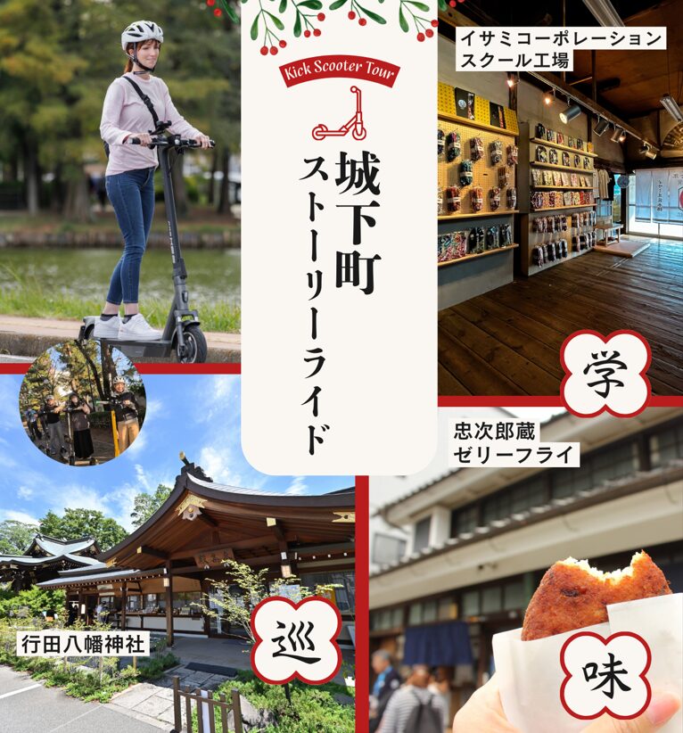 忍城や足袋蔵などの日本遺産構成資産や花手水で有名な行田八幡神社などの人気観光スポットを、地域ガイドによる説明を聞きながら、電動キックボードに乗って“移動そのものを楽しむ”新感覚体験型ツアー。