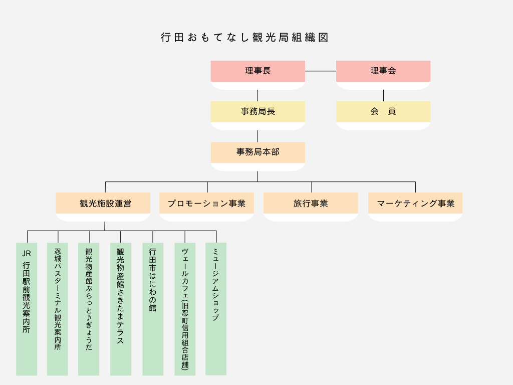 (1)観光に関する情報の収集及び調査研究に関すること(2)行田ブランド形成に向けたデータに基づく戦略の策定(3)国内外へのプロモーションの実施(4)旅行業法に基づく旅行業に関すること(5)行田市及び公共団体等からの受託事業(6)観光施設関連の運営(7)地場産品の改善指導、開発支援、開発及び宣伝・販売(8)観光関連事業従事者の資質向上(9)地方公共団体、観光関連団体等との連携・協力(10)その他、この法人の目的を達成するために必要な事業 |
