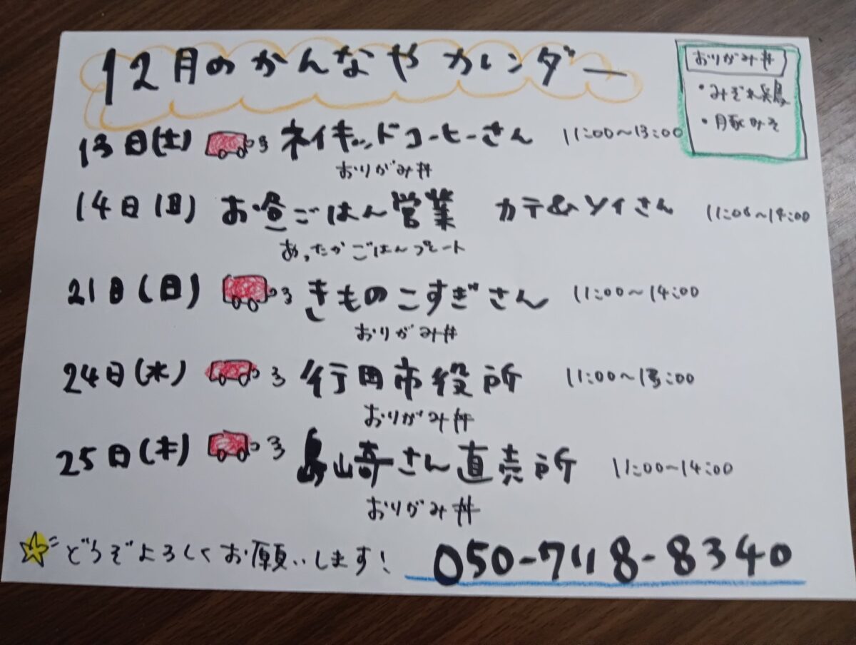行田の人気おうち食堂「野菜時々肉食堂 かんなや」(2025年現在店舗での営業は休止中)こだわりの味をもっと気軽に楽しんでもらうために、キッチンカーで出店中!地元・埼玉の旬の野菜や古代米をはじめ、季節ごとの厳選素材を活かしたお料理を、移動販売スタイルでお届けしています。