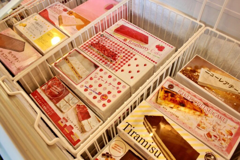 ショーケースには、定番のケーキから季節感あふれるものまで、多彩な冷凍ケーキが並びます。冷凍とは思えないほどの味わいと品質で、ご家庭でのデザートや急なおもてなしにも便利に利用できます。