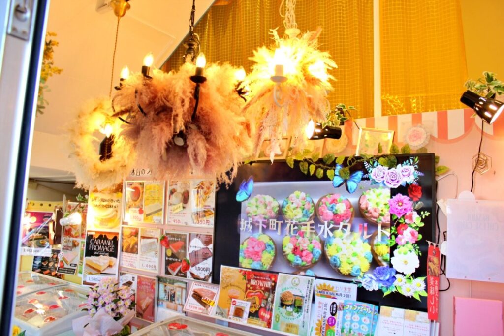 常時30種類以上の冷凍ケーキを取り扱う直売所、大きなフラワーシャンデリアが出迎えます。