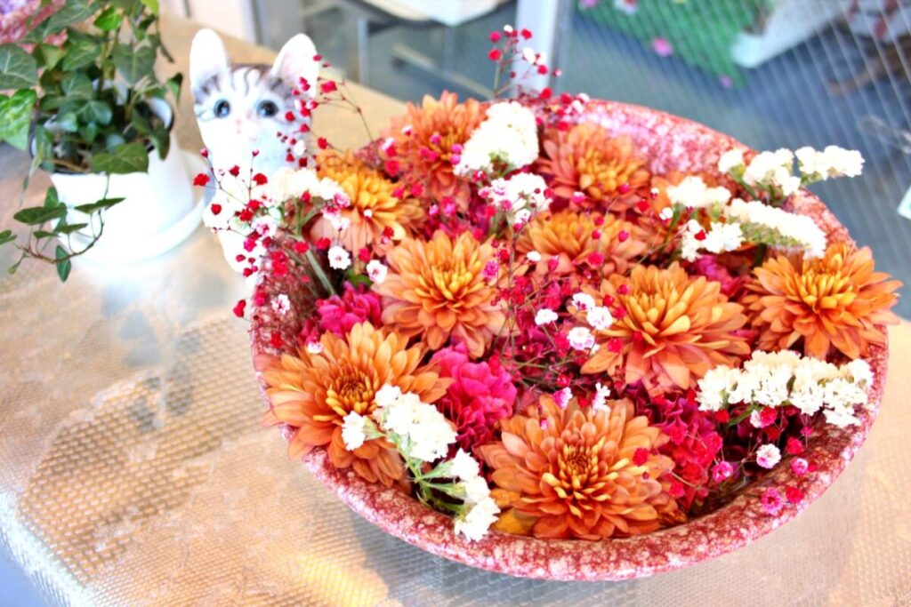 不定期で花手水の生け花イベントも開催されています。詳しくはお店のインスタをご覧ください。