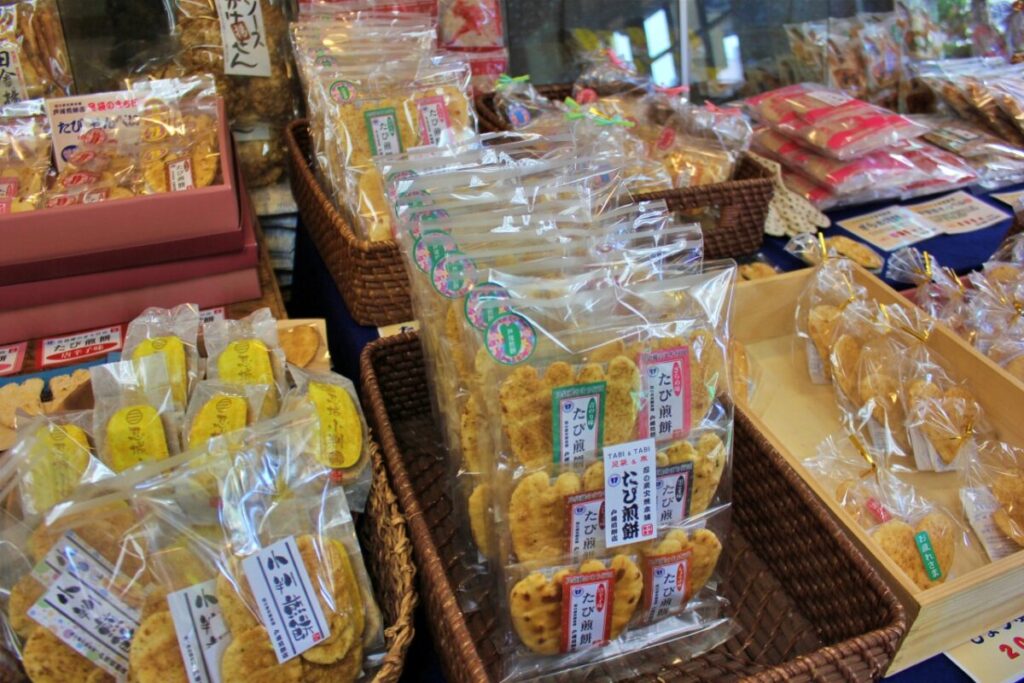 中でも人気なのが、行田の足袋のまちにちなんだ、可愛らしい足袋形の薄焼き煎餅。軽やかな食感で食べやすく、お土産としても人気の一品です。味は、香ばしい醤油、風味豊かな青のり、香り高い黒胡麻、ピリッとした胡椒、ほどよい辛さの唐辛子、甘みのあるざらめの6種類をご用意。お好みに合わせて、さまざまな味わいを楽しむことができます。